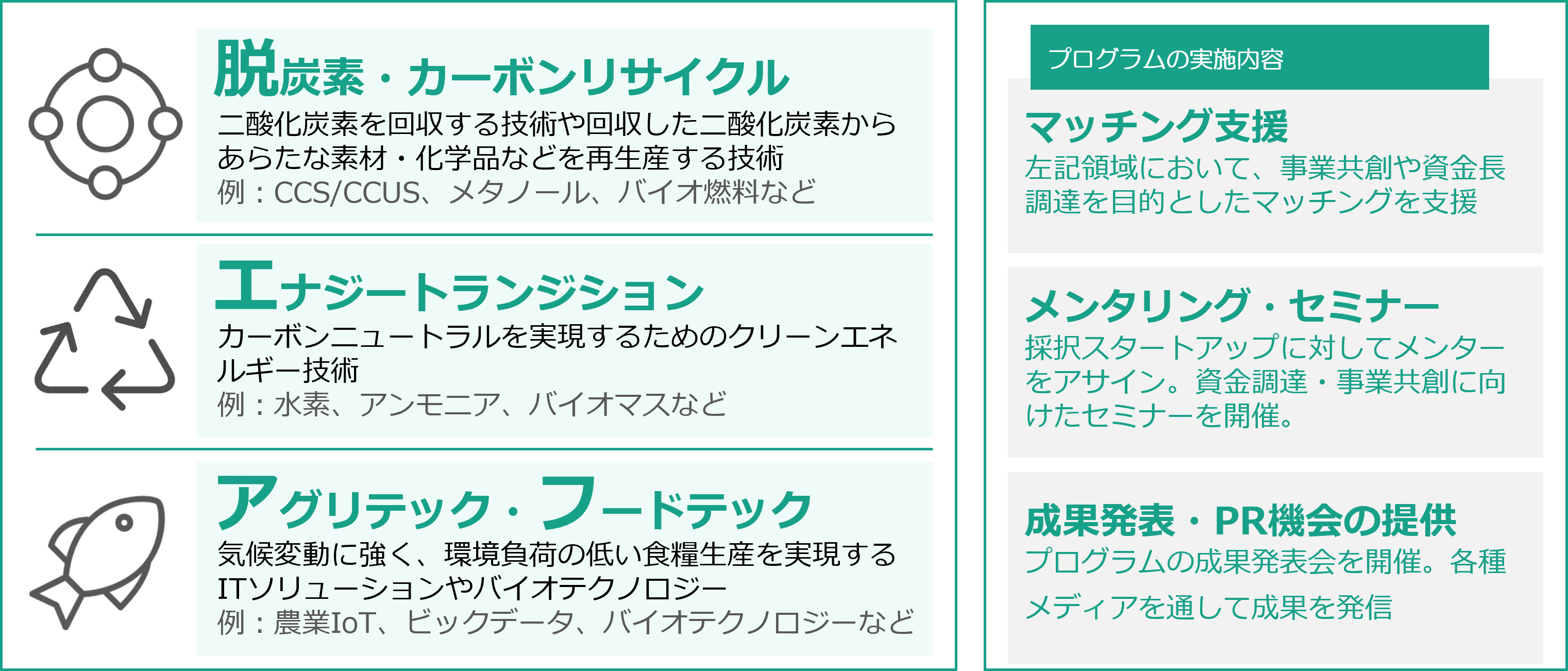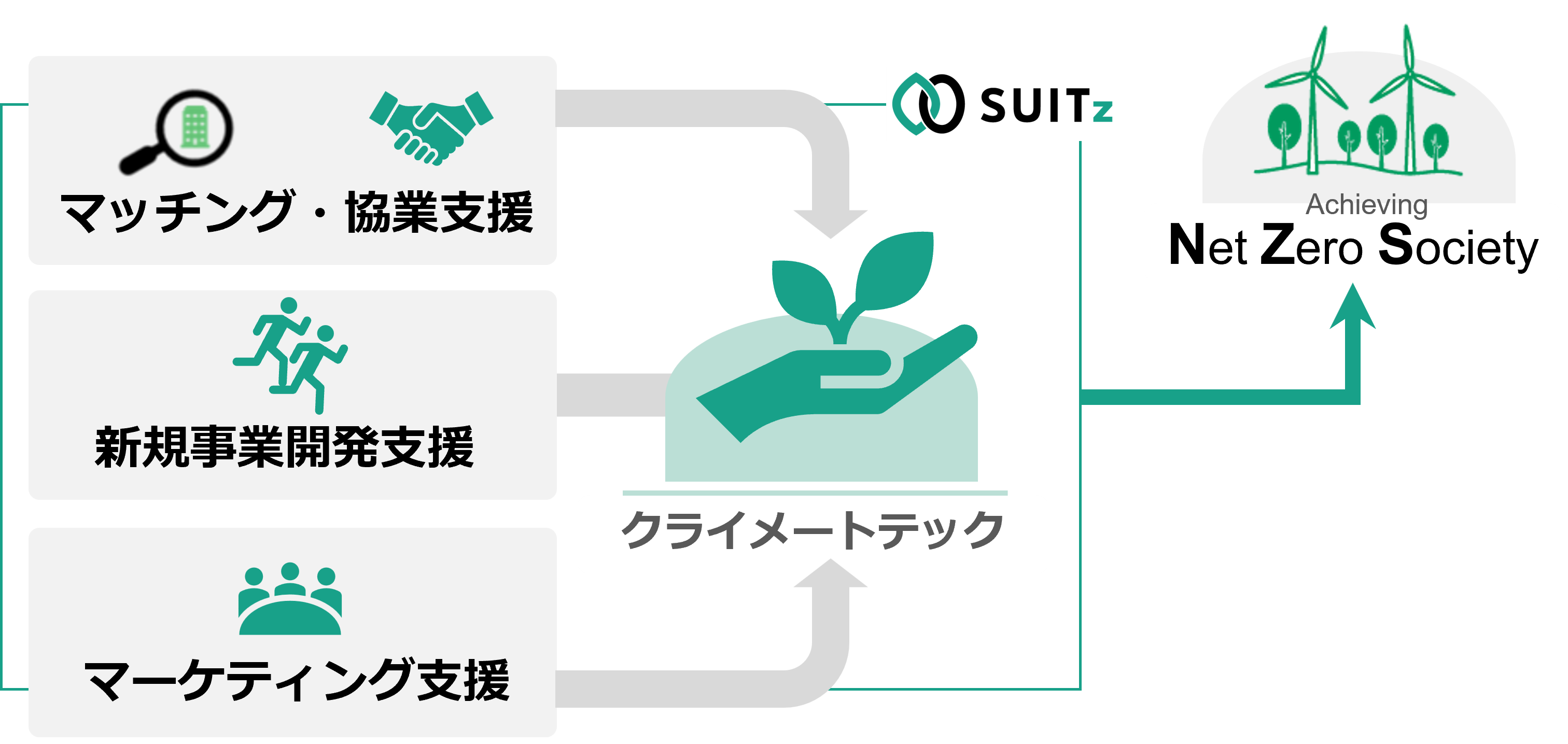 アドライトが展開するネットゼロのための共創プラットフォーム「SUITz(スーツ)」のプラットフォーム基盤を活用した、クライメート領域のスタートアップを対象とするアウトバウンド&インバウンドのアクセラレーションプログラムです。クライメートテック領域の中でも以下の3分野(脱炭素・カーボンリサイクル、エナジートランジション、農業・食料)で事業を展開するスタートアップに対して、マッチングやメンタリングなどの各種プログラムコンテンツを提供します。(https://tokyo.suitz.jp/)